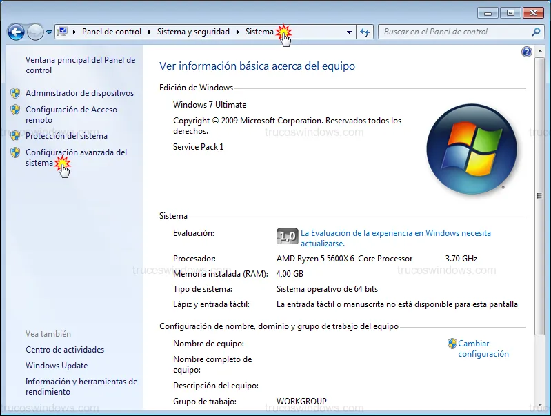- En el panel lateral izquierdo, selecciona el enlace Configuración avanzada del sistema.